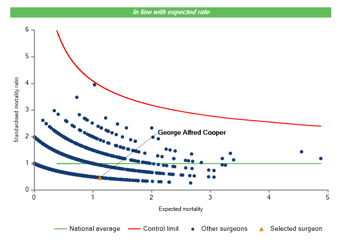 The vertical axis figures are presented as a standardised mortality ratio. This means the values do not represent percentages of patients who have died, but they represent the proportion of deaths compared to the national average. The data is also risk adjusted to take account of the fact that different surgeons may operate on more higher-risk or lower-risk patients e.g. because of demographics in the patient population they work with.