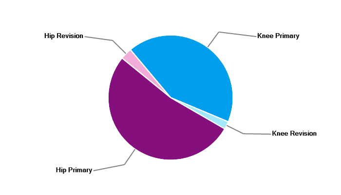 Primary hip replacement Revision hip replacement Primary total knee replacement Primary unicondylar (partial) knee replacement Revision knee replacement |