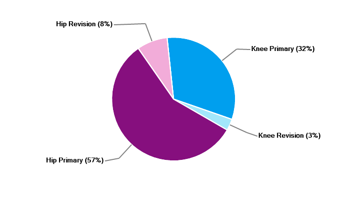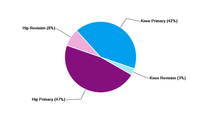 Primary hip replacement Revision hip replacement Primary total knee replacement Primary unicondylar (partial) knee replacement Revision knee replacement |