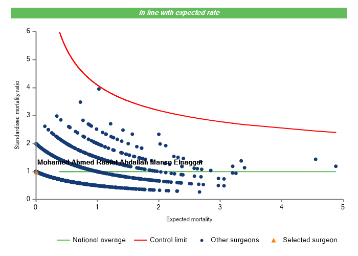 The vertical axis figures are presented as a standardised mortality ratio. This means the values do not represent percentages of patients who have died, but they represent the proportion of deaths compared to the national average. The data is also risk adjusted to take account of the fact that different surgeons may operate on more higher-risk or lower-risk patients e.g. because of demographics in the patient population they work with.