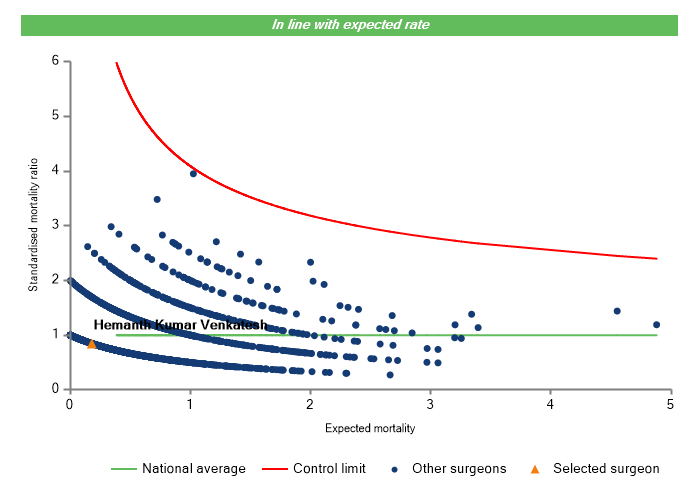 The vertical axis figures are presented as a standardised mortality ratio. This means the values do not represent percentages of patients who have died, but they represent the proportion of deaths compared to the national average. The data is also risk adjusted to take account of the fact that different surgeons may operate on more higher-risk or lower-risk patients e.g. because of demographics in the patient population they work with.