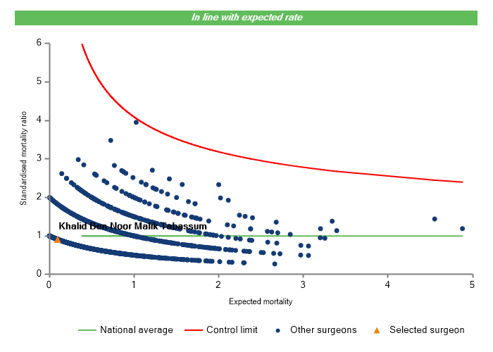 The vertical axis figures are presented as a standardised mortality ratio. This means the values do not represent percentages of patients who have died, but they represent the proportion of deaths compared to the national average. The data is also risk adjusted to take account of the fact that different surgeons may operate on more higher-risk or lower-risk patients e.g. because of demographics in the patient population they work with.