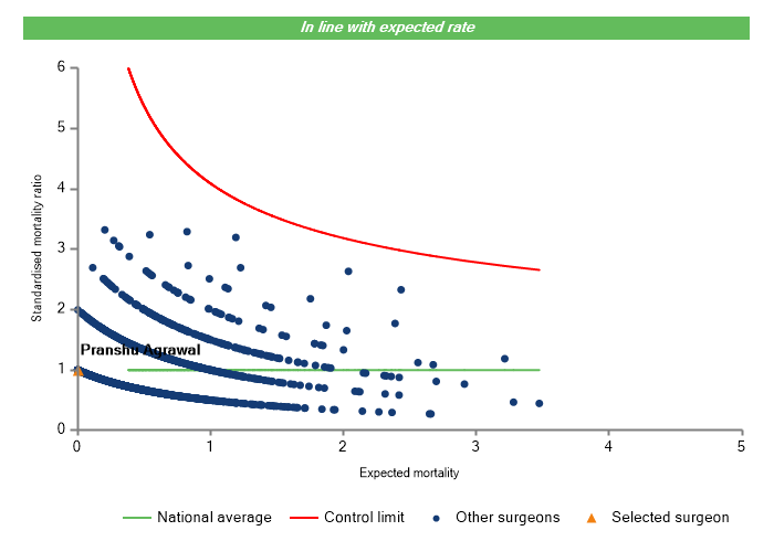 The vertical axis figures are presented as a standardised mortality ratio. This means the values do not represent percentages of patients who have died, but they represent the proportion of deaths compared to the national average. The data is also risk adjusted to take account of the fact that different surgeons may operate on more higher-risk or lower-risk patients e.g. because of demographics in the patient population they work with.